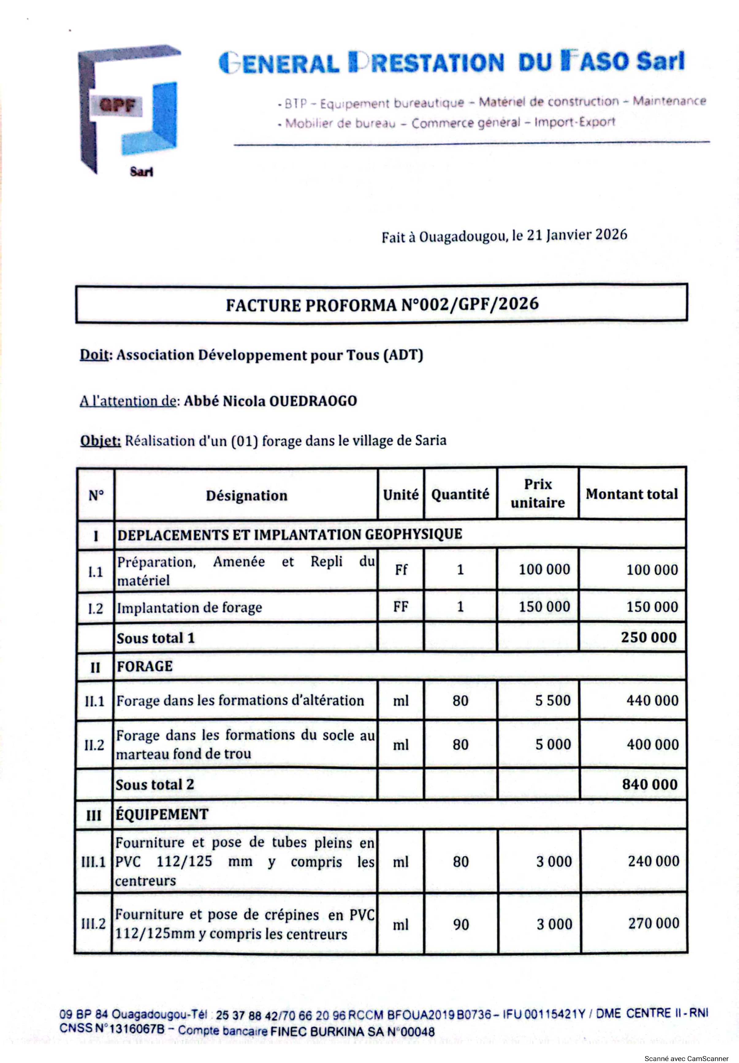 Abbiamo cercato acqua potabile a Saria (80 km a nord di Koudougou)perforando il terreno e trovata a 60 mt. di profondità': N.12* 52' 21.8" -- W.2* 18' 44.5".